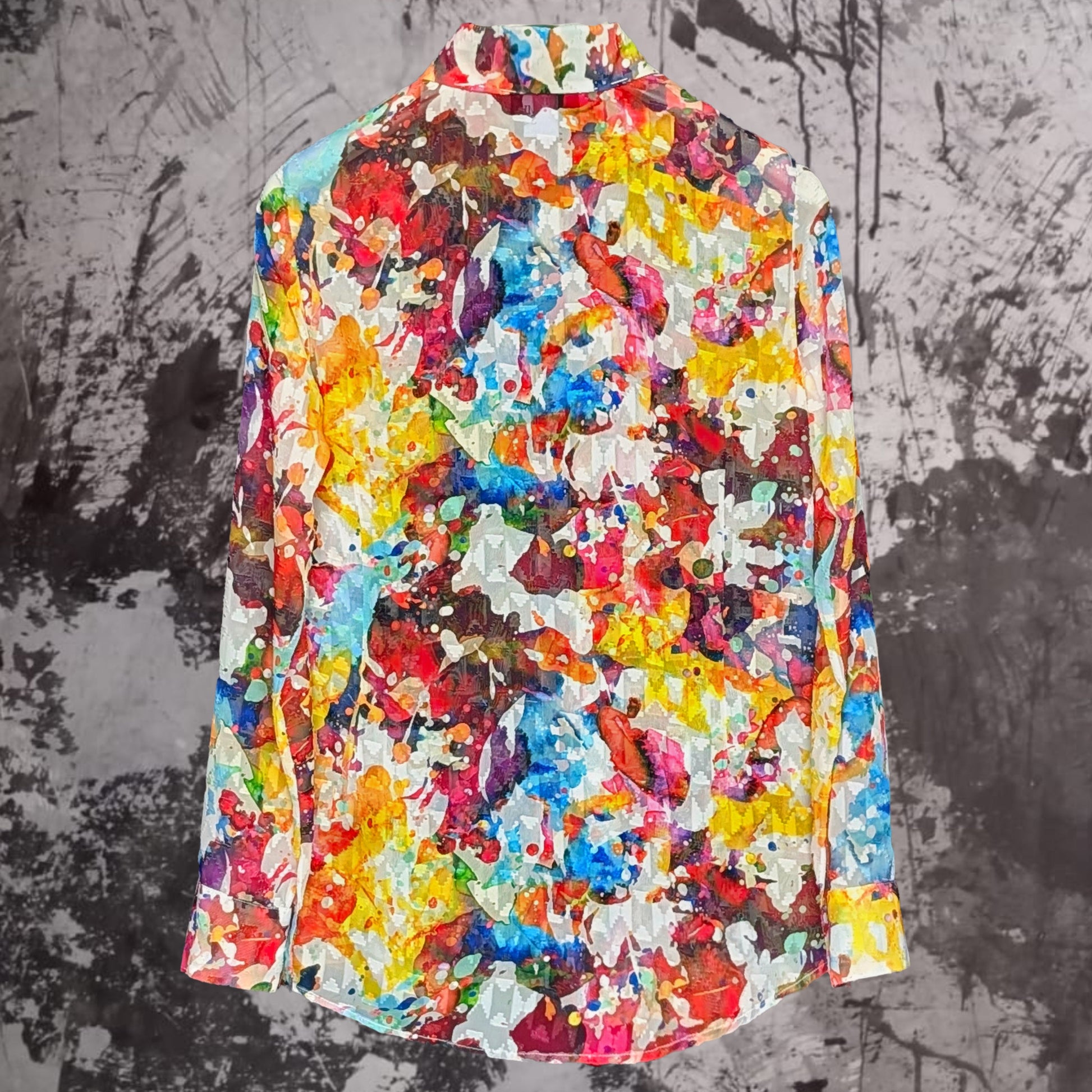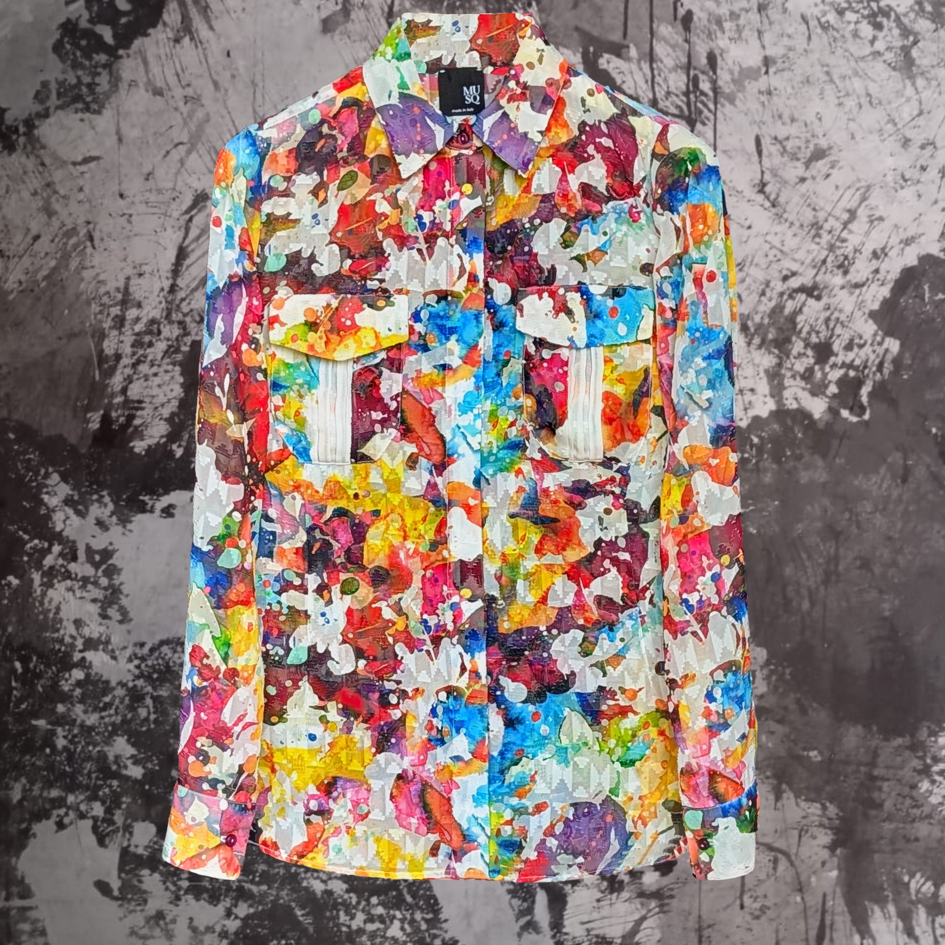 La camicia Noemi è una tela da indossare, un inno all'autenticità che celebra l'arte e la funzionalità. Realizzata in un esclusivo tessuto stampalia, un operato overstock non più riproducibile, questo capo è un pezzo unico e irripetibile. La sua fantasia astratta multicolore è una dichiarazione di stile per chi non ha paura di distinguersi, scegliendo una moda che è anche un'espressione di pura arte.