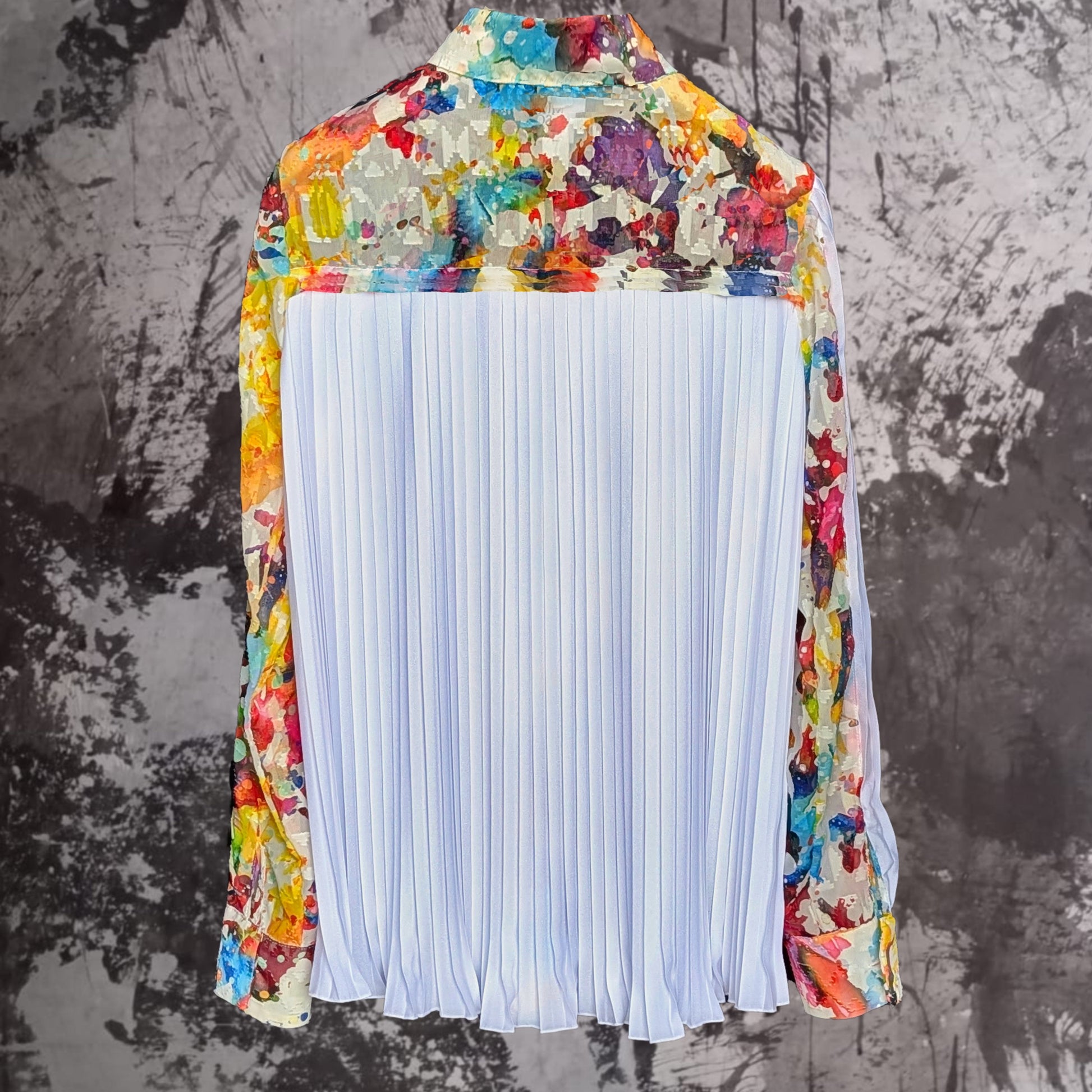 I suoi dettagli sono la sua identità: un raffinato inserto plissé insaccato nella manica sinistra aggiunge un tocco di movimento inaspettato, mentre il pannello plissé posizionato con maestria sotto il carré della schiena crea un effetto visivo sorprendente e unico. L'abbottonatura a scomparsa esalta la silhouette pulita e naturale, garantendo un'estetica lineare e minimalista. Realizzata con un tessuto operato overstock di alta qualità, questa camicia è una scelta consapevole e un investimento in un capo durevole che ti accompagnerà nel tempo. Mantiene la sua bellezza e il suo fascino inalterati, confermando la sua natura di capo amato, e non di tendenza passeggera.