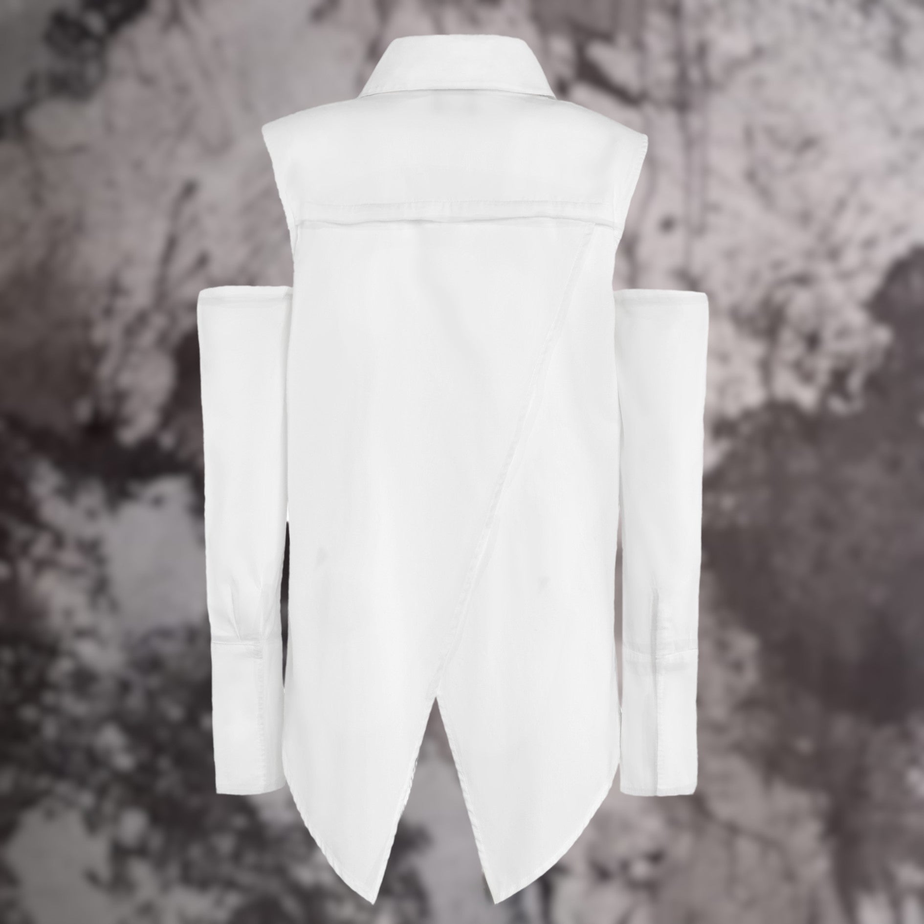 Il suo design è un'esplorazione della forma: le lunghezze asimmetriche con punte laterali creano un movimento audace, bilanciato dalla morbidezza del tessuto. La schiena è pensata per il dinamismo, con pannelli sovrapposti che aggiungono profondità e fluidità senza costringere. Il postone ad abbottonatura a scomparsa conferisce un look minimalista e pulito. Ma l'elemento che rende questo capo unico sono le sue maniche staccabili, che ti permettono di trasformare la camicia in un capo versatile, adatto a ogni stagione e occasione.