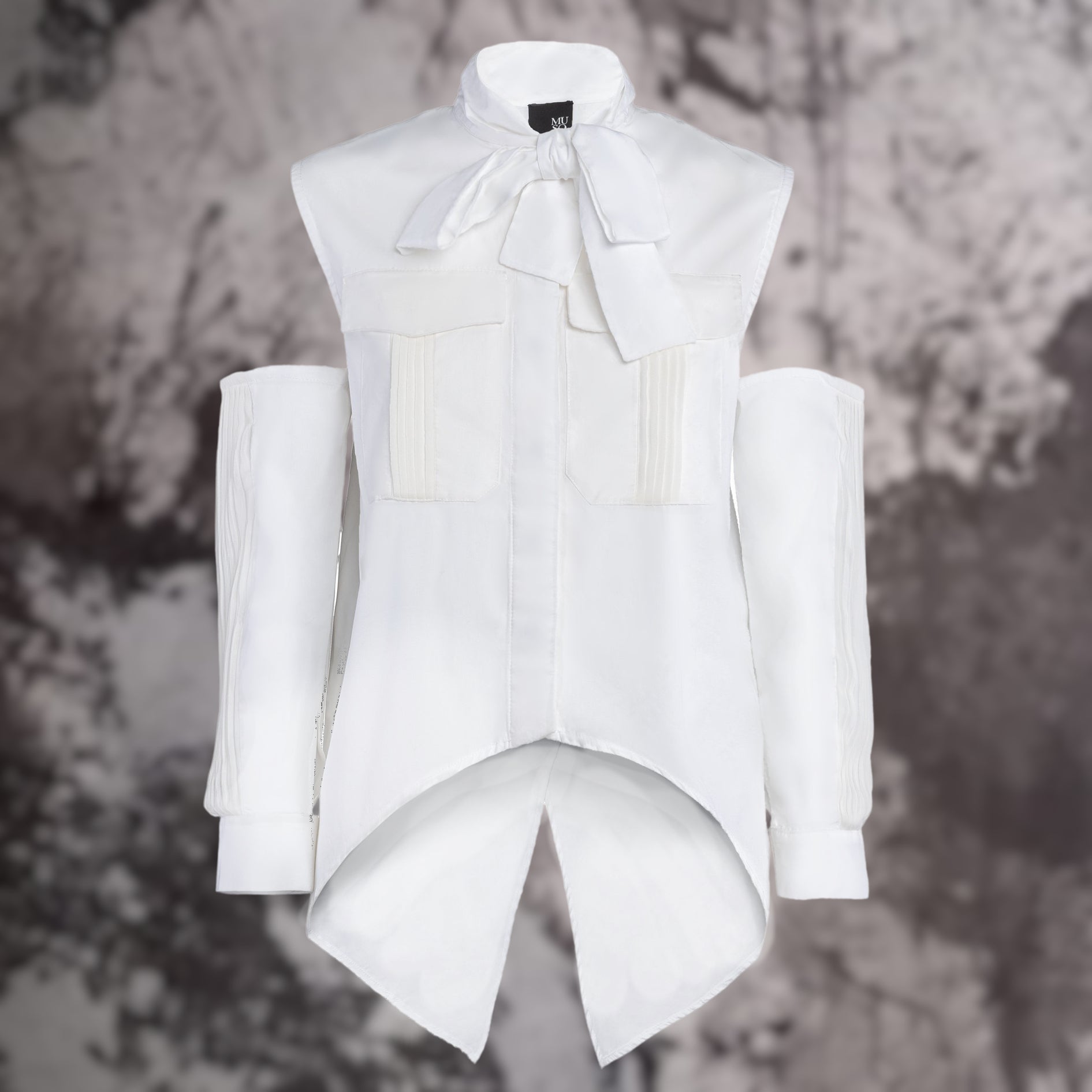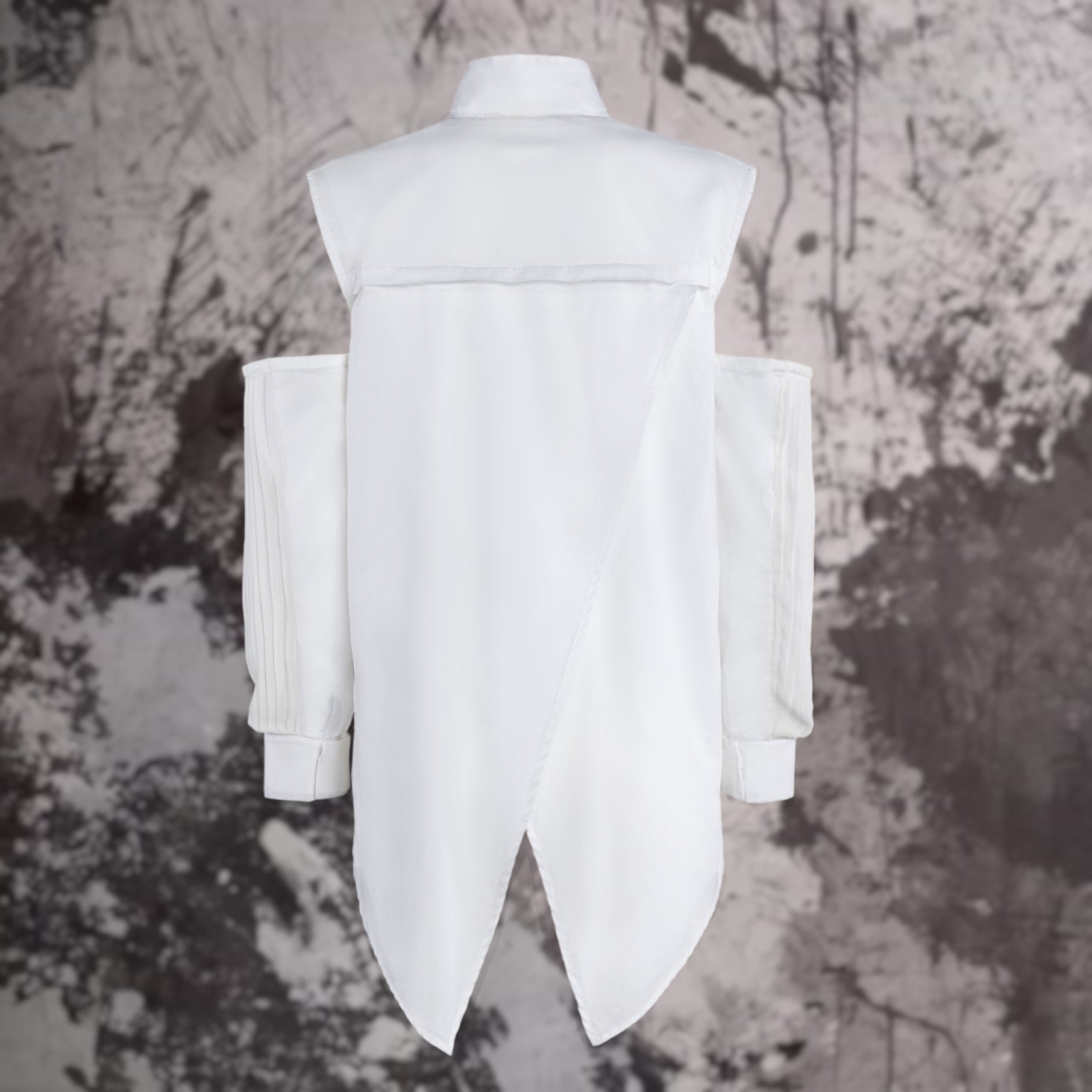 Il suo design è un'esplorazione della forma: le lunghezze asimmetriche con punte laterali creano un movimento audace, mentre la schiena con pannelli sovrapposti aggiunge una fluidità che si adatta a ogni silhouette. Il vero cuore di questo capo risiede nella ricchezza dei suoi dettagli. Le maniche staccabili offrono una versatilità inaspettata, mentre le tasche applicate con pattina aggiungono un tocco di carattere e utilità. Gli inserti plissé sul fronte e sulle maniche creano un gioco di texture che cattura lo sguardo, e il delicato collo a nastro completa il tutto con una nota di raffinata femminicità, tutto esaltato da un'ab bottonatura a scomparsa.
