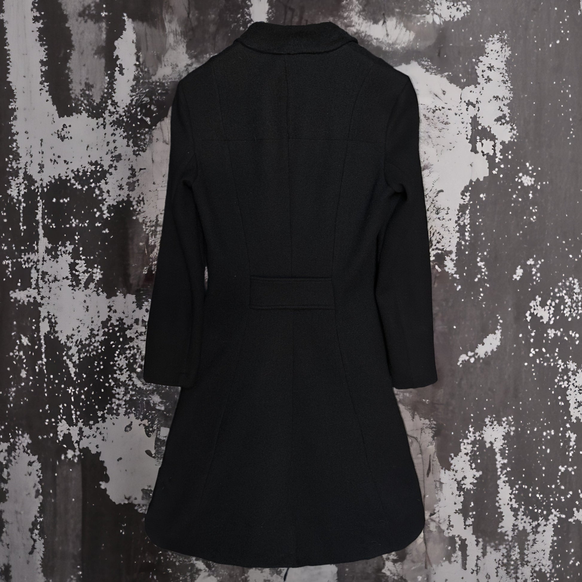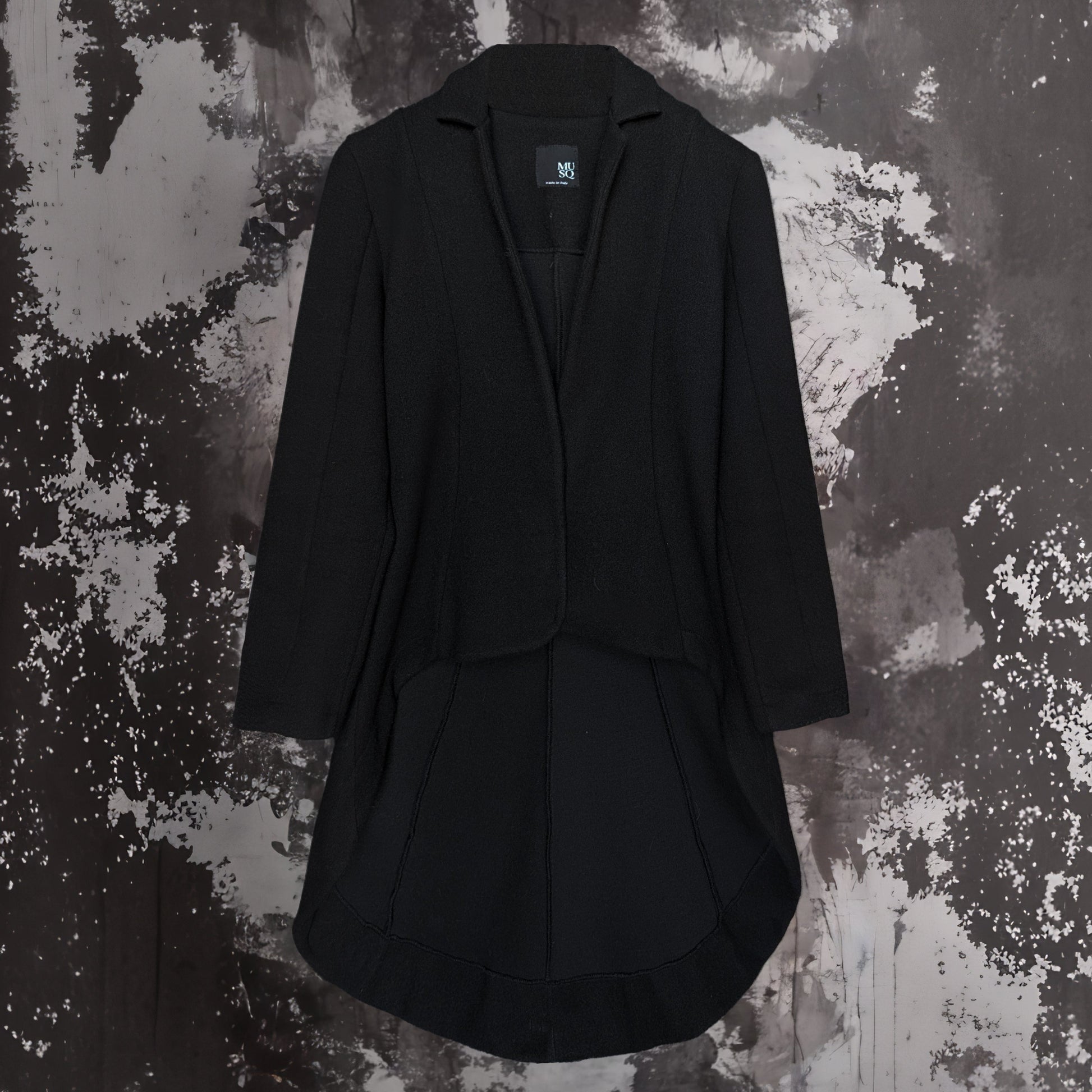 Realizzata in un tessuto peso cappotto molto pesante, questa giacca sfida le convenzioni. Si indossa aperta per esaltare una linea pulita e verticale, ma su richiesta può essere dotata di un bottone automatico invisibile all'interno, trasformandosi in un cappotto chic e avvolgente. I dettagli sartoriali sono meticolosi: una martingala fissa sulla schiena aggiunge struttura, mentre il fondo crea un sorprendente contrasto di volumi.