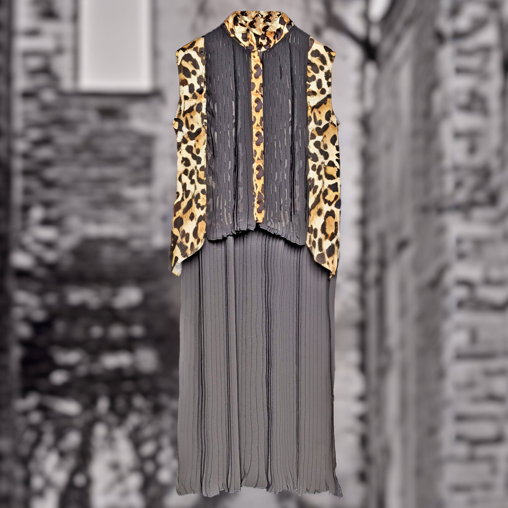 Ogni dettaglio è una scelta di stile precisa. Il tessuto principale è un maculato animalier che avvolge il corpo con una caduta morbida e un'energia vibrante. I pannelli applicati in plissé nero, ricavati da un overstock di poliestere, creano un contrasto cromatico deciso e drammatico. Questo gioco di opposti tra la stampa audace e il nero classico definisce la personalità del capo. La schiena scende con grazia fino alle caviglie, mentre la costruzione frontale con punte esterne più lunghe del centro camicia dona una silhouette dinamica e grintosa. Il postone con abbottonatura nascosta mantiene la pulizia del design, lasciando che il pattern animalier sia il vero protagonista.