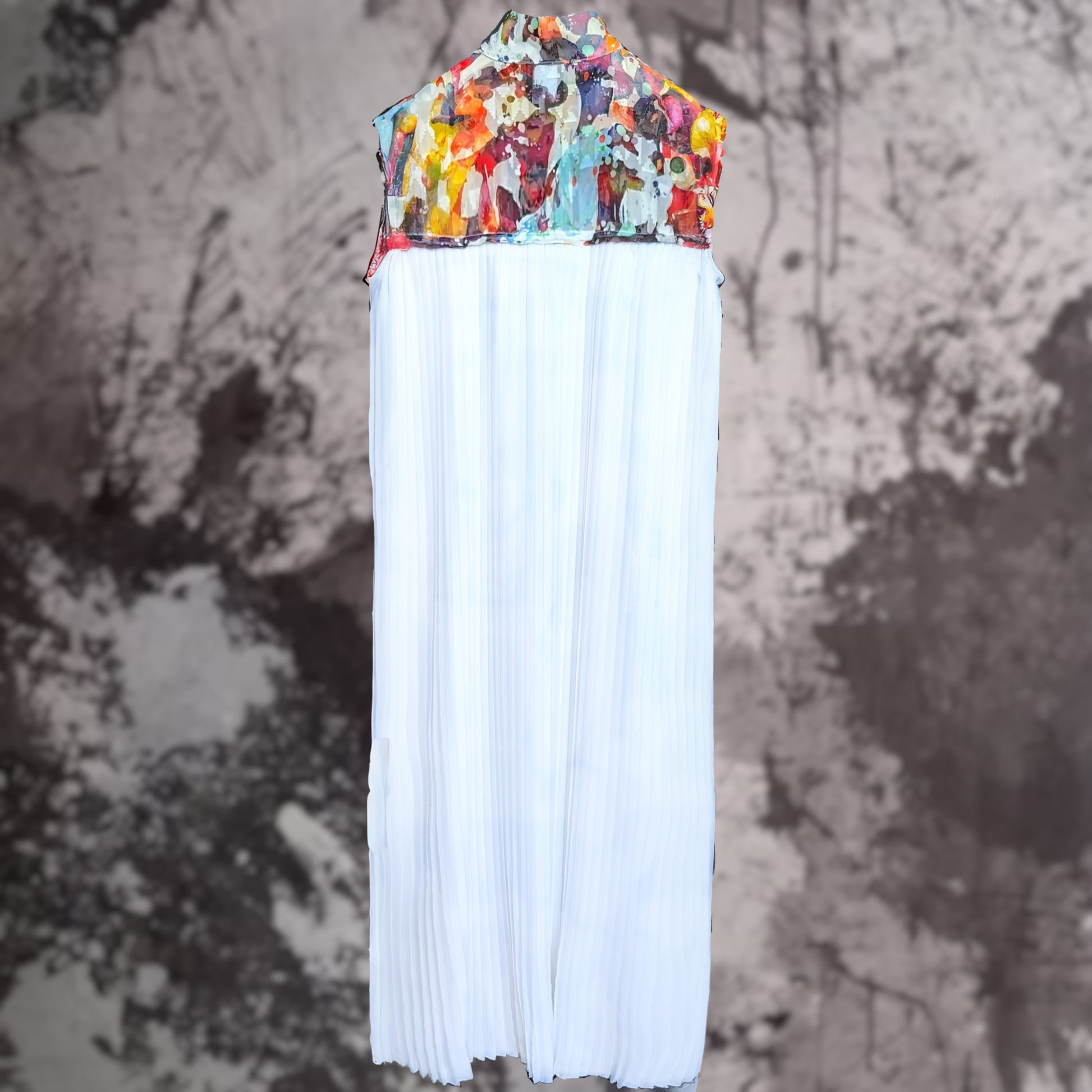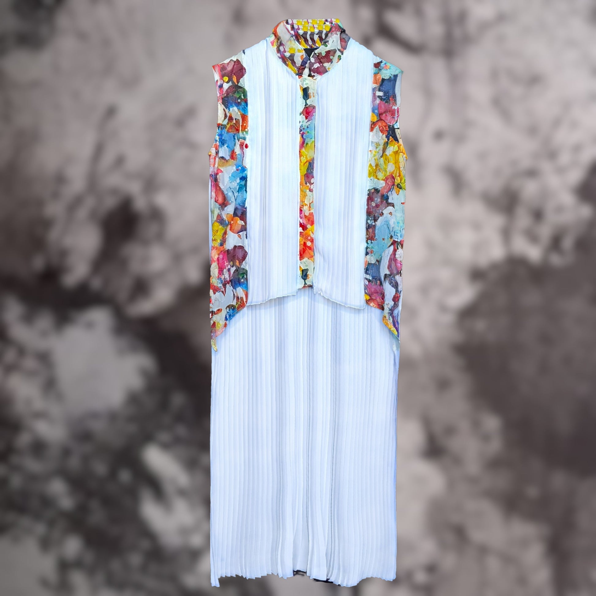 Ogni elemento di questa camicia racconta una storia. Il tessuto Stampalia, un poliestere operato fine pezza che abbiamo recuperato, è stato scelto per la sua texture tattile e la sua fantasia stampata che cattura lo sguardo. È un materiale che unisce la resistenza alla leggerezza, perfetto per una silhouette dinamica e grintosa. Il modello conserva la sua anima scultorea: i pannelli in plissé di recupero applicati sul davanti e la schiena che scende con grazia fino alle caviglie creano un movimento che è allo stesso tempo fluido e strutturato. La costruzione frontale con punte esterne più lunghe del centro camicia dona una linea moderna e inconfondibile, mentre il postone con abbottonatura nascosta mantiene la pulizia del design.